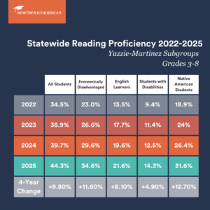 New Mexico has been at the bottom of most education rankings for over a decade. It is something that Amanda Aragon and the NewMexicoKidsCAN team are determined to change. Now, we’re seeing the first signs that their years of advocacy and the resulting changes are translating into tangible progress for New Mexico’s kids. Last week, the New Mexico Public Education Department released 2024–2025 statewide assessment data, revealing that reading proficiency increased for the second year in a row, climbing from 36% in 2022 to 39% in 2023 to 44% in 2025.